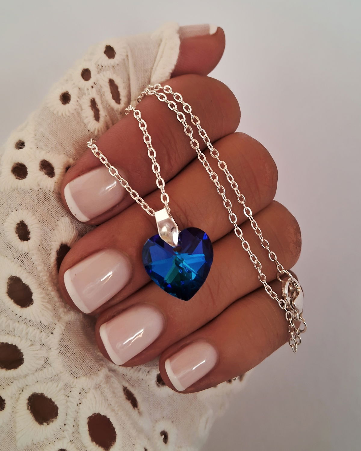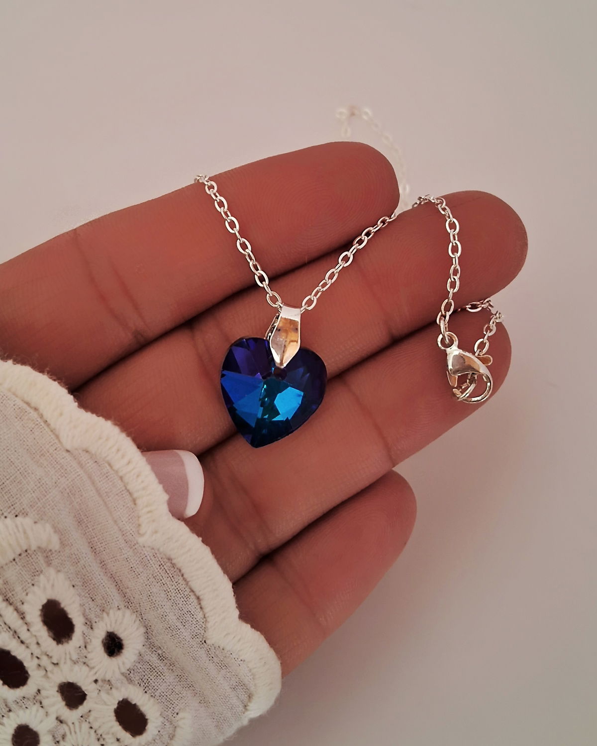 Conjunto Cadena Espejito 0.4mm 50cm Largo, Dije Corazón Cristal Azul 14mm